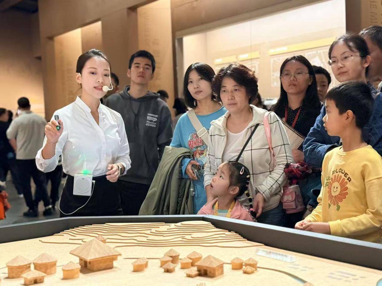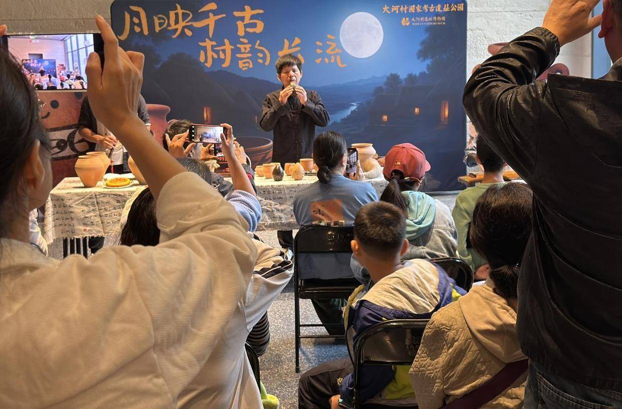 音乐欣赏环节之后,现场开展了中秋诗词互动活动,“村民”们踊跃参与,吟诵与中秋相关的经典诗句,成功背诵的观众获得了博物馆准备的专属纪念礼品,现场气氛温馨而活跃。随后,荣誉“村民”们还品尝了大河村特色月饼。唇齿间的甜蜜与刚刚萦绕耳畔的乐音、诗句相互交融,更添中秋韵味,也将现场氛围推向温馨的高潮。味觉与听觉的盛宴过后,“探索・古今对话”环节随之展开。在博物馆资深讲解员的引领下,荣誉“村民”们开启了遗址探秘之旅。大家漫步于古老的遗迹之间,聆听文物背后的故事,感受大河村先民的智慧与生活气息。讲解员凭借扎实的专业知识,将数千年前的村落生活场景娓娓道来,与刚刚聆听的史前乐音形成了奇妙的呼应,完成了一场跨越时空的文明对话。博物馆还为荣誉“村民”们准备了专属的“礼遇・文创时光”,大家可享文创商品特别优惠,有机会将富有大河村遗址文化元素的创意产品带回家,为此次文化之旅留下一份独特纪念。