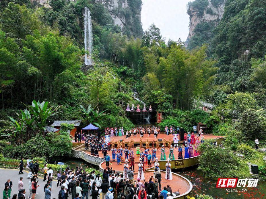 山水为幕,非遗作魂。景区精心组织非遗展演,近百名民间艺人倾情参与。茅古斯舞原始古朴,打溜子节奏明快,土家武术刚劲有力,三棒鼓技艺精湛,山歌串唱婉转动听……